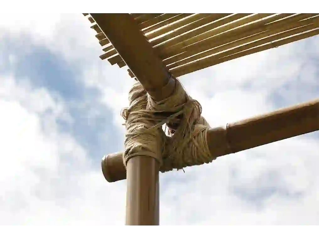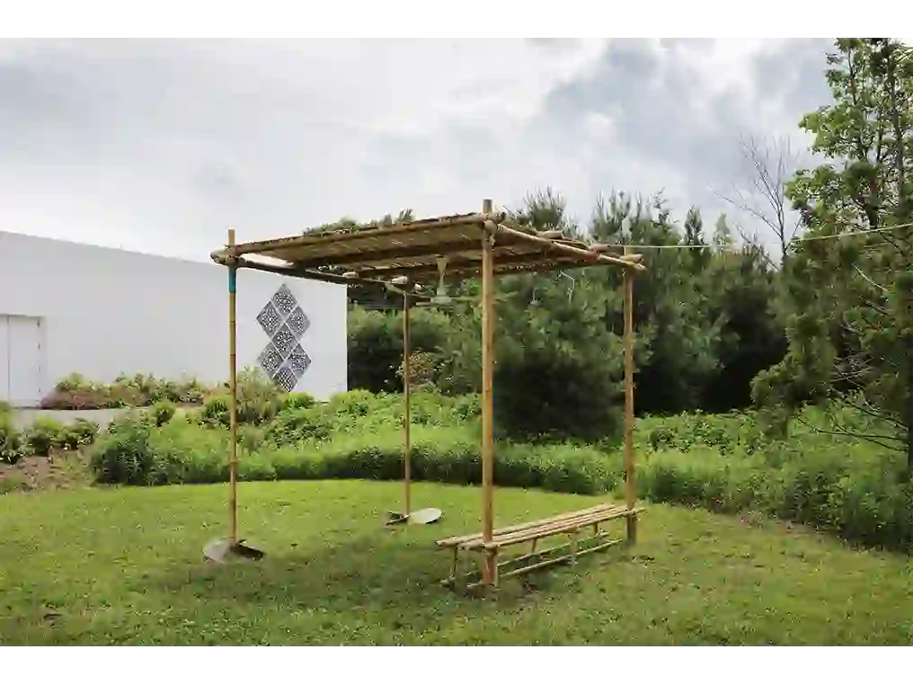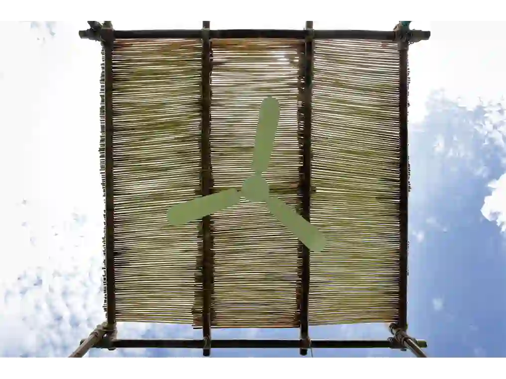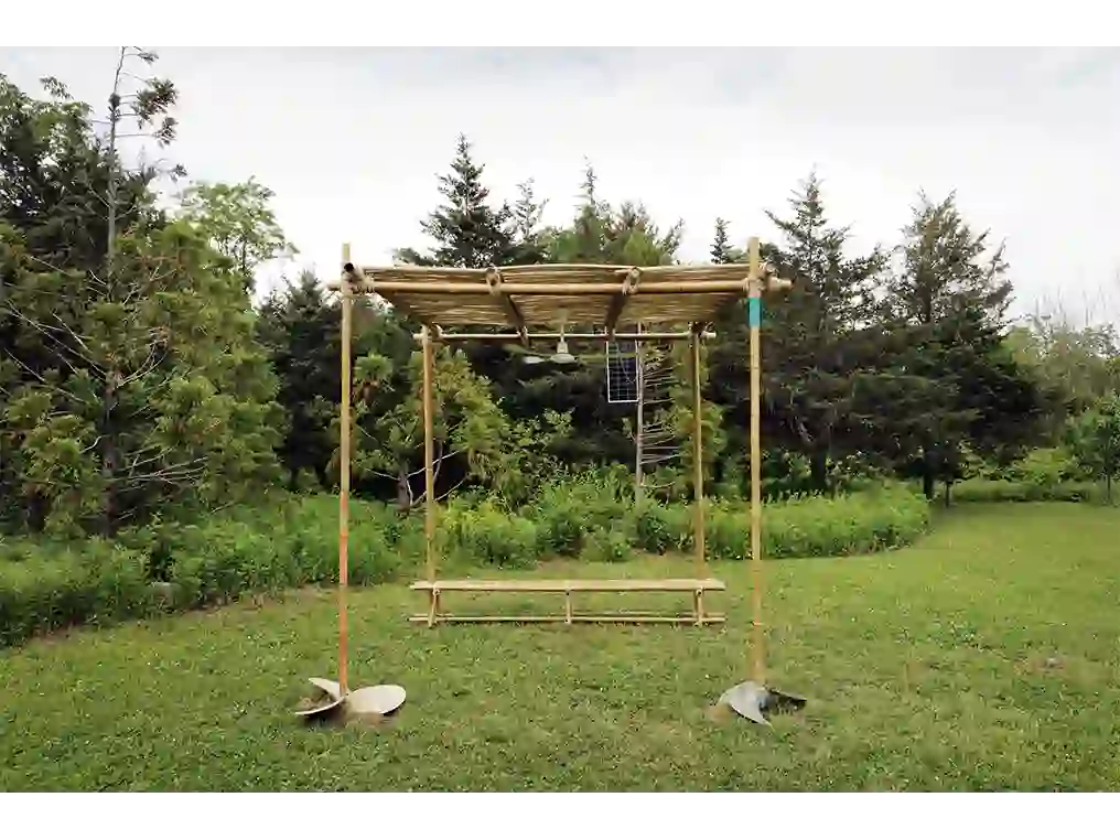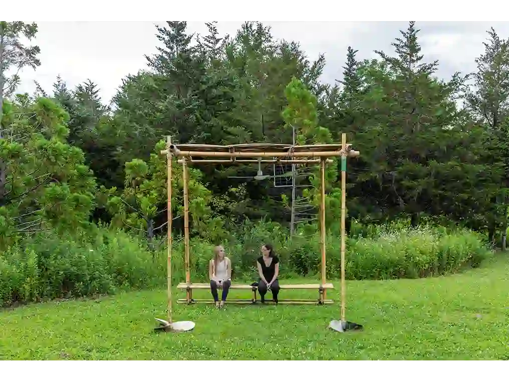 The installation consisted of a gazebo made of natural materials, bamboo and rope, and features two ship propellers–a recurring motif in Esposito's work. A bench welcomed visitors to sit and soak in the breezes created by a solar power fan. Presented as a device that constructs new, possible relationships, the artist offered us a space to rest and reflect on the impact of our actions on a global scale.